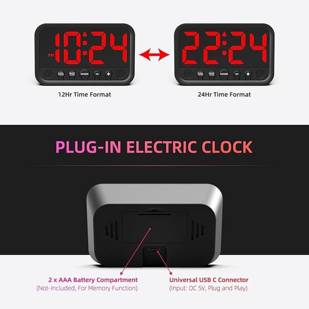 - • PLUG-IN ELECTRIC CLOCK WITH MEMORY FUNCTION The electric alarm clock features a widely used USB C connector for universal compatibility, and the 2xAAA battery-backup function ensures that time and settings are preserved in case of a power outage.