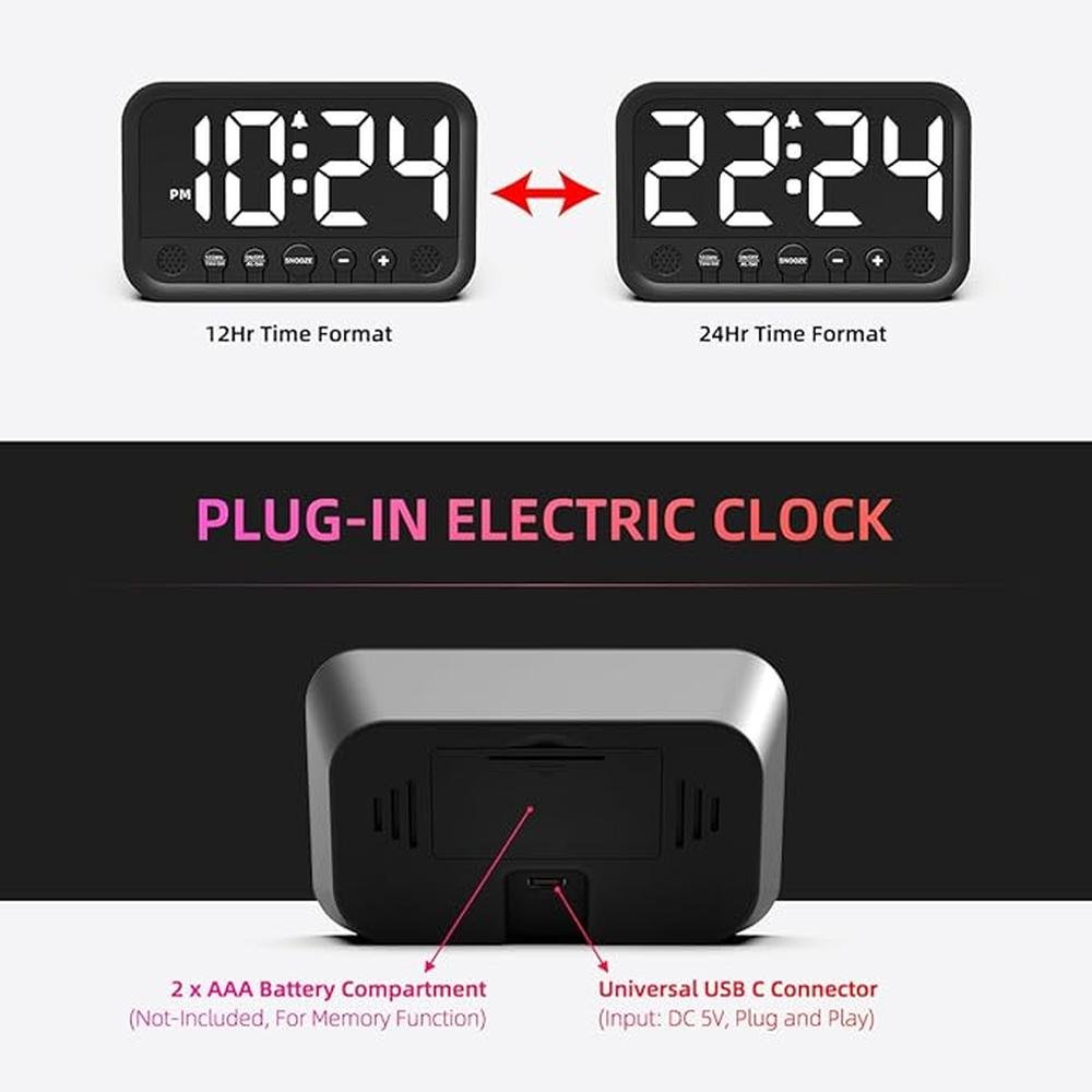 • • PLUG-IN ELECTRIC CLOCK WITH MEMORY FUNCTION The electric alarm clock features a widely used USB C connector for universal compatibility, and the 2xAAA battery-backup function ensures that time and settings are preserved in case of a power outage.