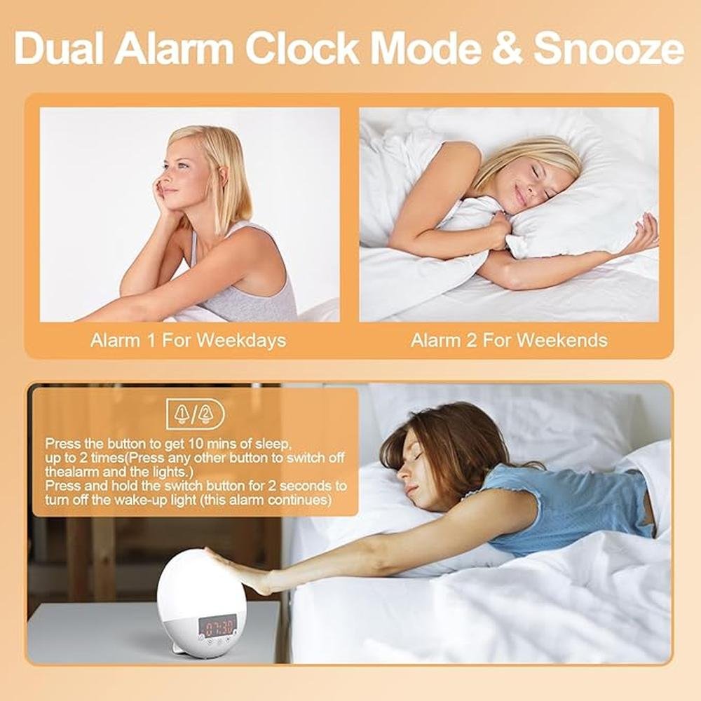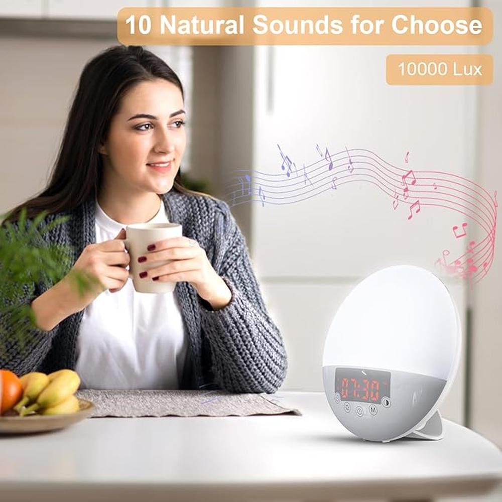• • Wake Up Light with Sunrise Alarm ClockThis wake up light with alarm clock is designed for everyone, especially for heavy sleepers and kids. The sunrise simulation light with 10 natural sounds will be on gradually from 3 brightness to 100 by 0-60 minutes before alarm setting time. The light will gradually brighten before the alarm time. Wake you up by nature.