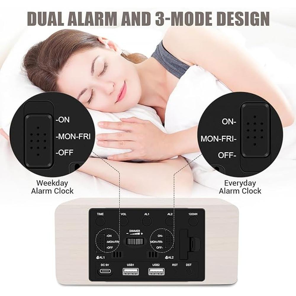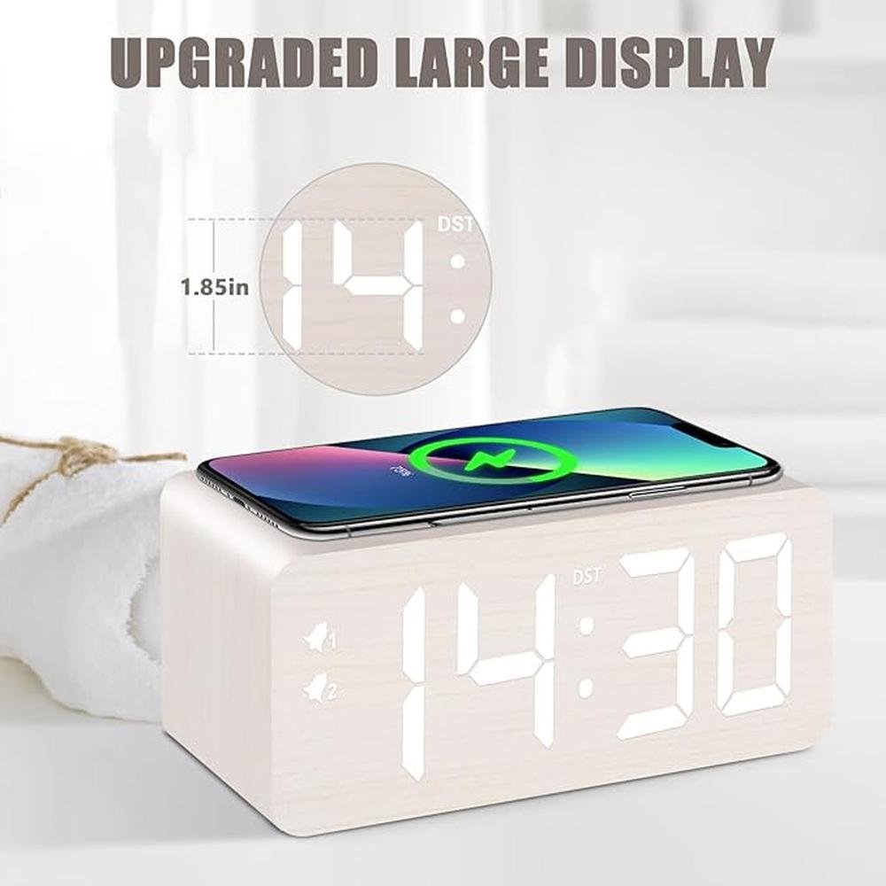 - • Multifunctional All-in-one Clock- It combines alarm clock, wireless charger and USB charging port - all in a minimalist wood box, ultra-compact design fits easily on any table, bedroom or bedside for decor.