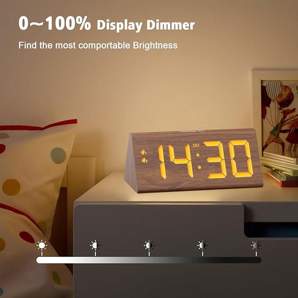 - • 0-100 Stepless Dimmer- Compared with the alarm clocks on the market that only have three or five levels of brightness adjustment, this wooden alarm clock adopts 100-level dimming technology. Customers can adjust the brightness to any percentilerange 0 100, which solves the problem of too bright display at night and helps you fall asleep better.