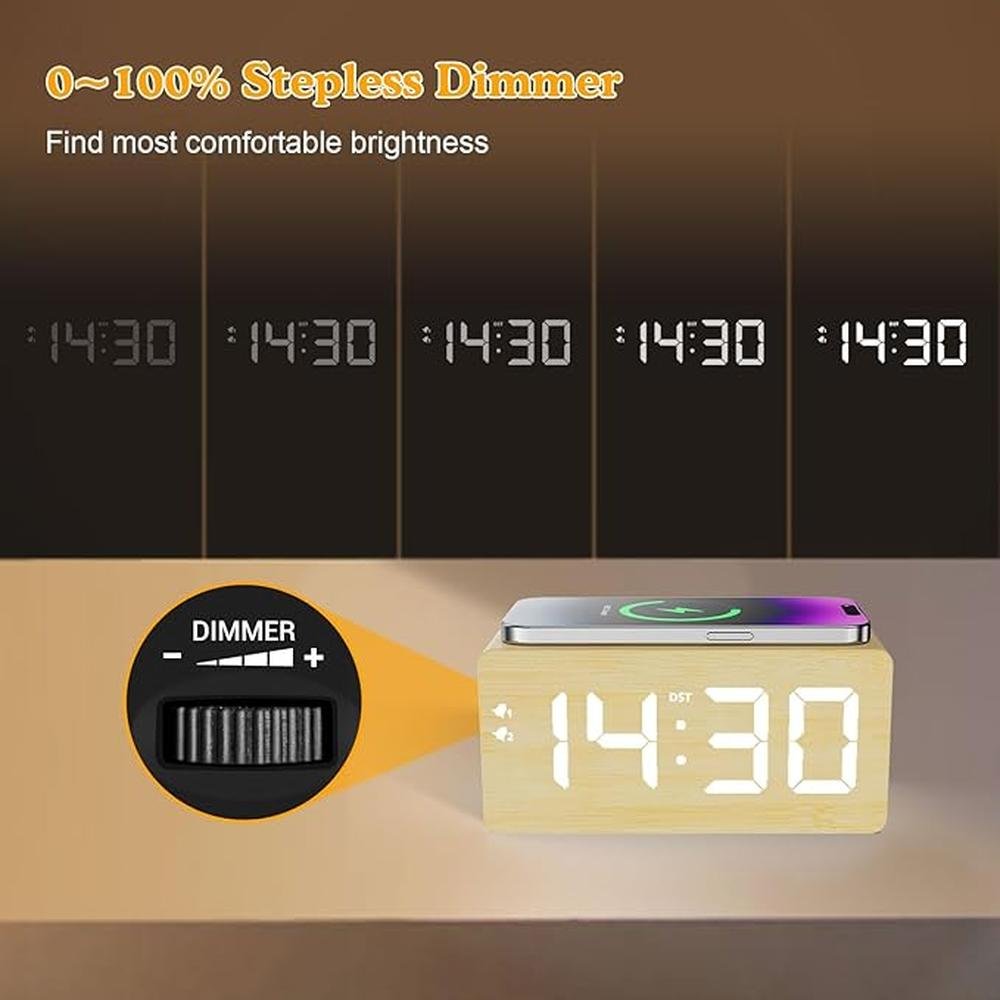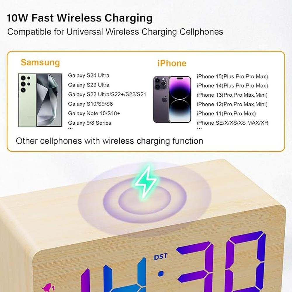 - • Fast Wireless Charger USB Charging Ports- Compared with other digital alarm clocks on the market which only have 5W wireless charging, this wooden digital alarm clock is upgraded to 10W wireless charging, which can achieve faster charging speed and save your phone charging time. Dual handy USB charging ports help you charge smart devices and other gadgets without having to look for adapters and other outlets.