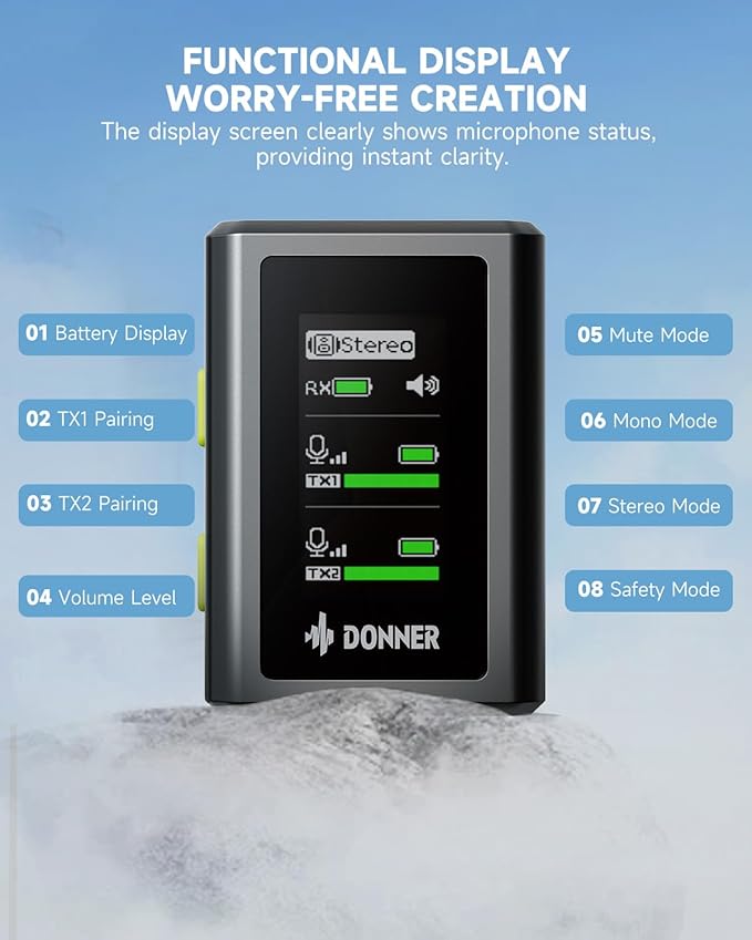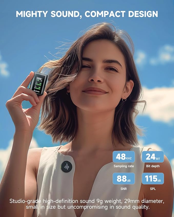 • • Ultra Portable, with Newly Functional Display VPM-20 owns new-upgraded unprecedented functional display which makes your adjustments at a glance. It features portability and extensive compatibility. Two Lavalier Microphones are only 9g in weight and 29mm in diameter each. Its equipped with USB-C, Lightning, and camera TRS interfaces, compatible with various devices. Easy to connect to each generation iPhoneiPad, Androidtablets, and professional cameras. The plug-play let you start creating without worry.