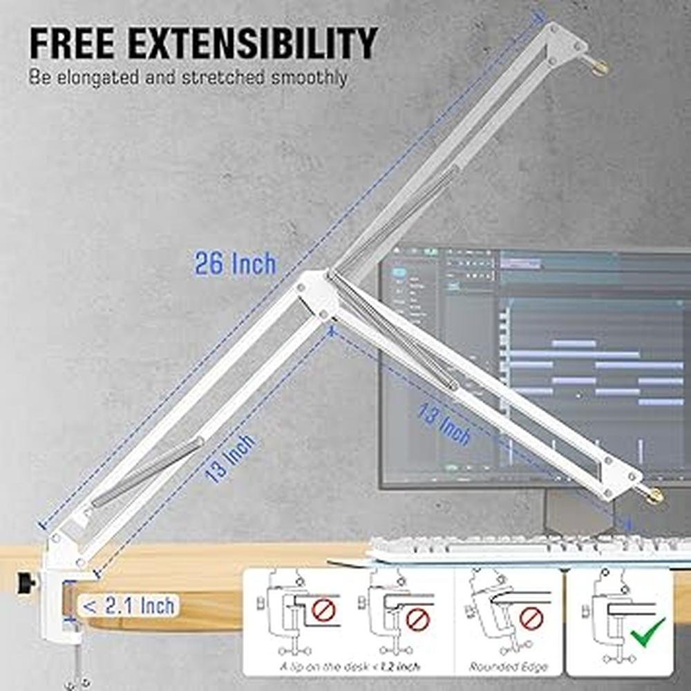 - • Adjustable Boom Arm Kit You can pull and push to adjust the boom arm bundle during youre doing live streaming or game commentary to streamline your experience for greater ease. The flexible extension and retraction of mic arm stand enable you to find the comfortable and suitable sound pickup position. The base can rotate 360 and the angle can be extended up to 180, fulfilling all your usage requirements in various situations.