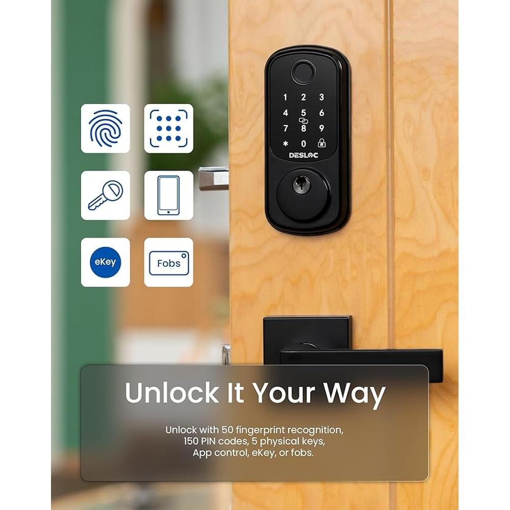 DESLOC B200 Fingerprint Smart Door Lock Set With 2 lever Handles, App Control, Easy Installation, Front Door Smart Deadbolt, Touchscreen Keypad, Emergency Power Port, 12Months Battery, Matte Black