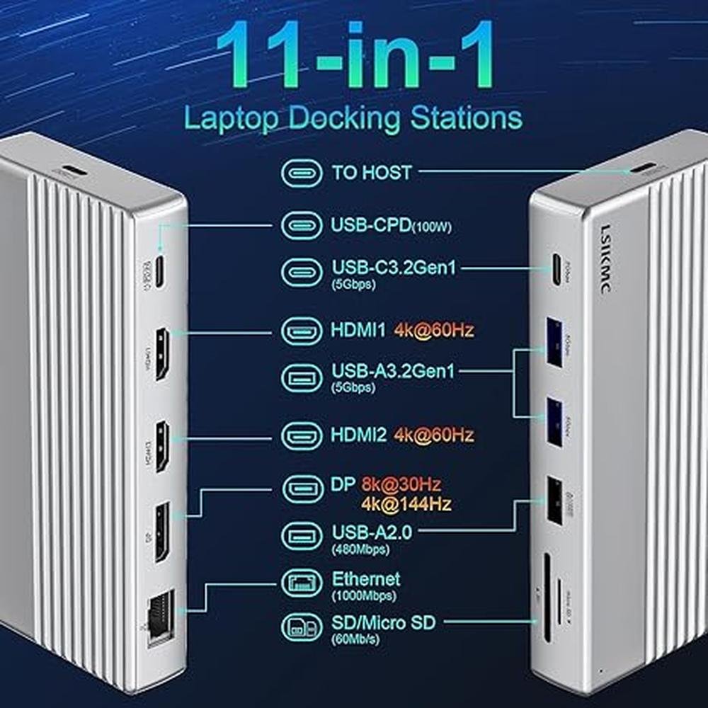 - • 11-IN-1 USB Docking Station Featuring a USB-C data port, two USB-A 3.0 (5Gbps), one USB-C (5Gbps) slots, dual HDMI and a DisplayPort for seamless usb to usbc-c adapter use. The 100W USB-C power port boosts this usb c dock charging capabilities, supporting high-definition triple-screen expansion. Includes an SDmicroSD card reader and Ethernet port, perfect for dual monitor setup via the dual monitor adapter function.