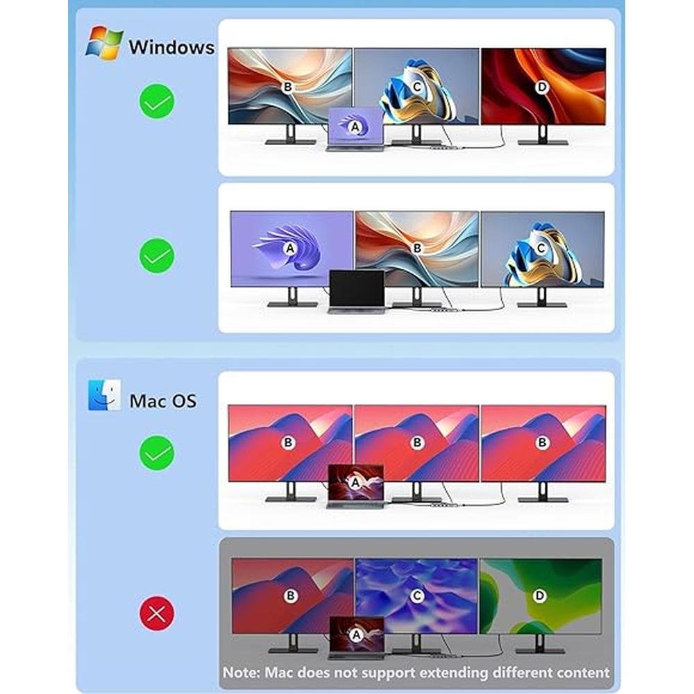 - • Triple 4K Display This universal docking station is outfitted with dual HDMI and one DP port, supporting single-screen mode at DP 8k30Hz, 4k144Hz, and 4k120Hz. When in dual-screen mode it operates dual HDMI or DPHDMI up to an impressive 4k60Hz. The triple display function also supports up to 4k60Hz. Integrated with a USB-C to USB adapter and USB-C hub, this enables seamless MST and SST functionality on Windows OS. (note MacBook users can only access mirror mode.)