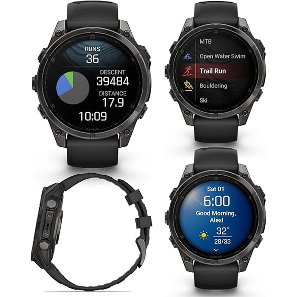 Be limitless. The f?nix 8 multisport GPS smartwatch is built for serious athletes and outdoor adventurers who want to push beyond their limits. It features a bright 1.4 AMOLED display, stainless steel bezel and powerful built-in LED flashlight for after-dark visibility. A built-in speaker and mic enable you to make and take calls from your wrist when your watch is paired to your smartphone. Power up your bodys performance, endurance and resistance to injury with the latest in targeted strength training plans plus a full range of sport-specific workouts. Performance insights help manage your exertion and build stamina, while training readiness features show how much recovery time you need between workouts, based on 247 wellness monitoring of heart rate, respiration, stress, sleep and more (data presented is intended to be a close estimation of metrics tracked). Take to the trails with built-in ABC sensors and TopoActive maps that can be easily downloaded via Wi-Fi connectivity. The dynamic round-trip routing feature helps simplify the planning of your runs or rides letting you set your target distance and receive turn-by-turn directions that adjust to get you back to your start on schedule. Enjoy extended off-grid adventures with up to 16 days of battery life in smartwatch mode. Plus, a 40-meter dive rating and leakproof metal buttons let you reach new depths of adventure. Additional features include music storage, Garmin Pay contactless payments (with a supported country and payment network), smart notifications (compatible smartphone required) and more.