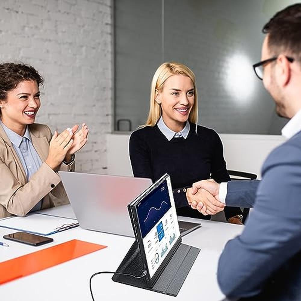 - • Ultra-Slim Portable DisplayPortable monitor features ultra-slim profile, it is easy to slides into your bag, allows you to carry it everywhere. The intelligent protective cover is made of high-quality PU material, it can fully protect the screen and prevent scratches. The smart cover base has two grooves, you can fold the screen side of the smart cover back serve as a stand to firmly support the screens bottom.