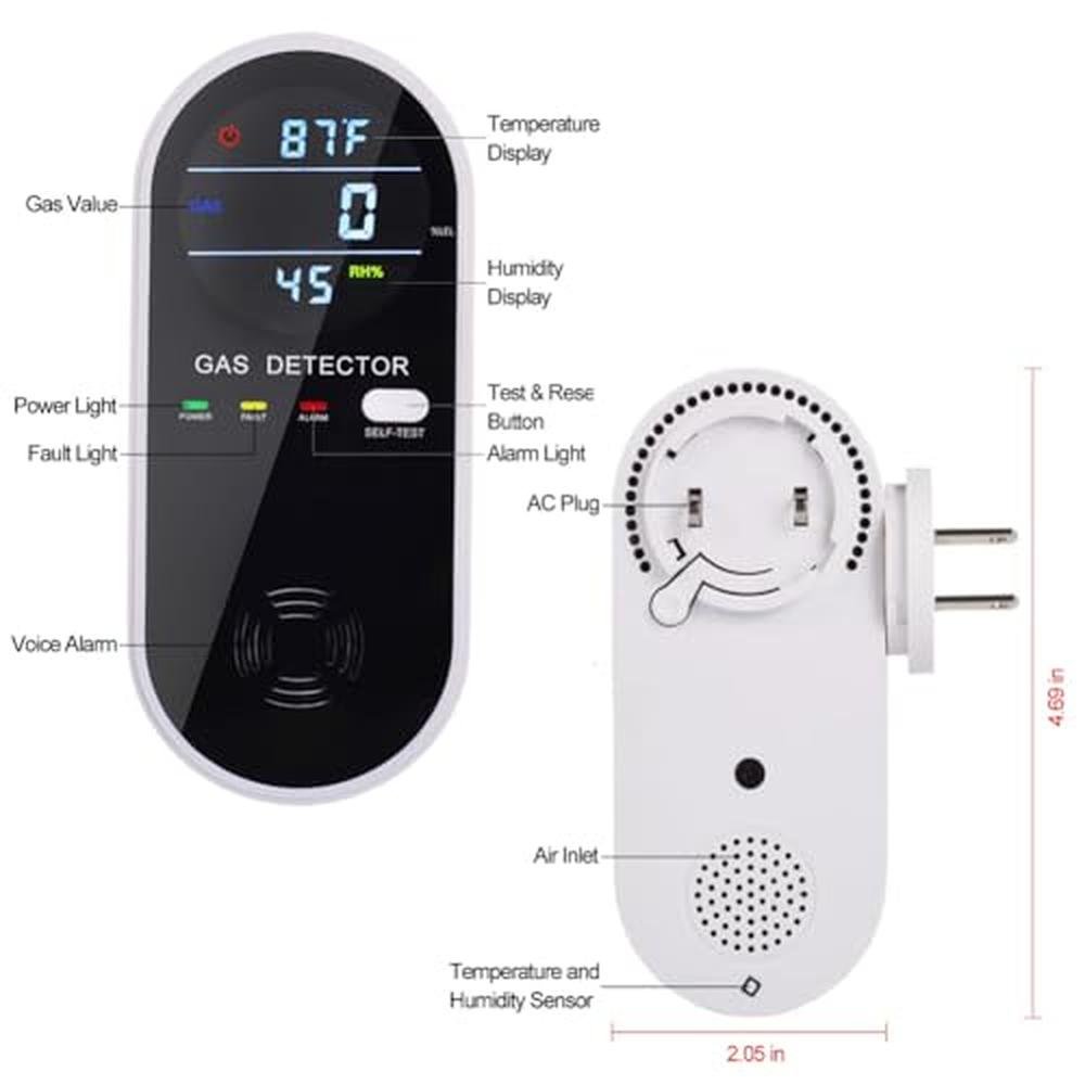 Plug-in gas leak detectors detect natural gas (methane, liquefied natural gas, etc.) and propane (Liquefied petroleum gas, etc.) in a timely manner to detect dangerous gases with light and verbal alarms, at the same time with high-definition display temperature and humidity, all day to protect the safety of family