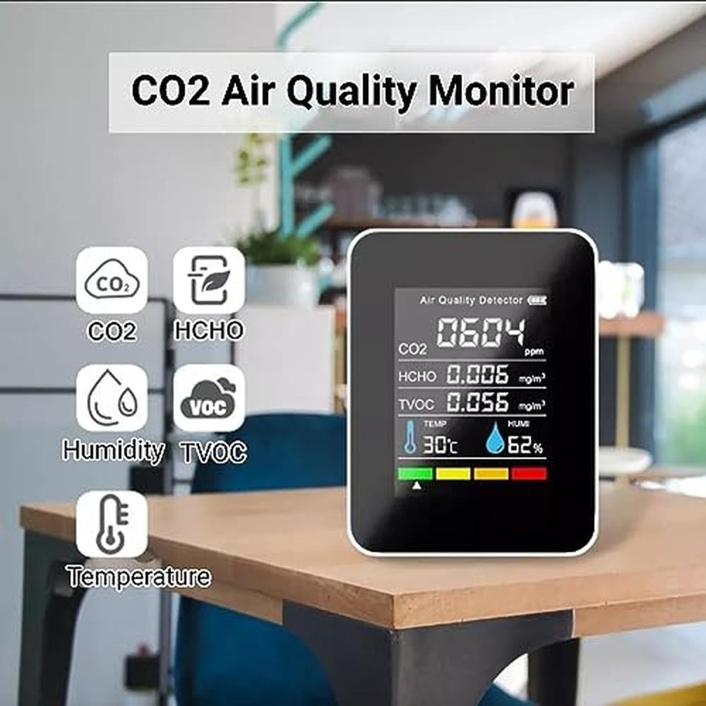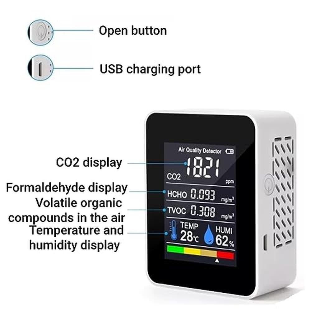 - • MULTIPLE USES 5 in 1 meter can detect carbon dioxide concentration in air, and HCHO, TVOC, Temp, Humi.