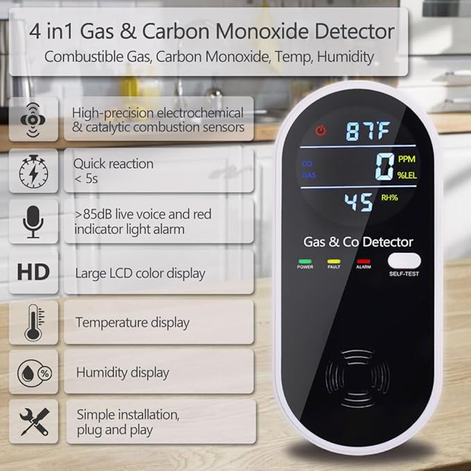 - • 4 in 1 Combination Gas Carbon Monoxide Detectors - Equipped with 4 major air indicators of Carbon Monoxide(0 to 2000PPM), Combustible Gas(0 to 10LEL) Temperature(1 to 176 ), and Humidity(0 to 95RH) to protect your family.