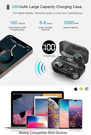 - • 160H Music Time Charge On The GoThanks to the Bluetooth 5.0 technology, You get 6-8H continuous playtime when earbuds fully charged. The charging case with built-in 3300 mAh battery provides 25 times full charge for the earbuds. You can also use the charging case to charge your phone. Never worry about running out of power.