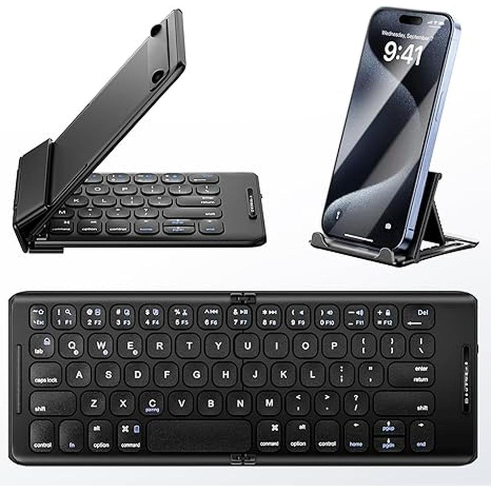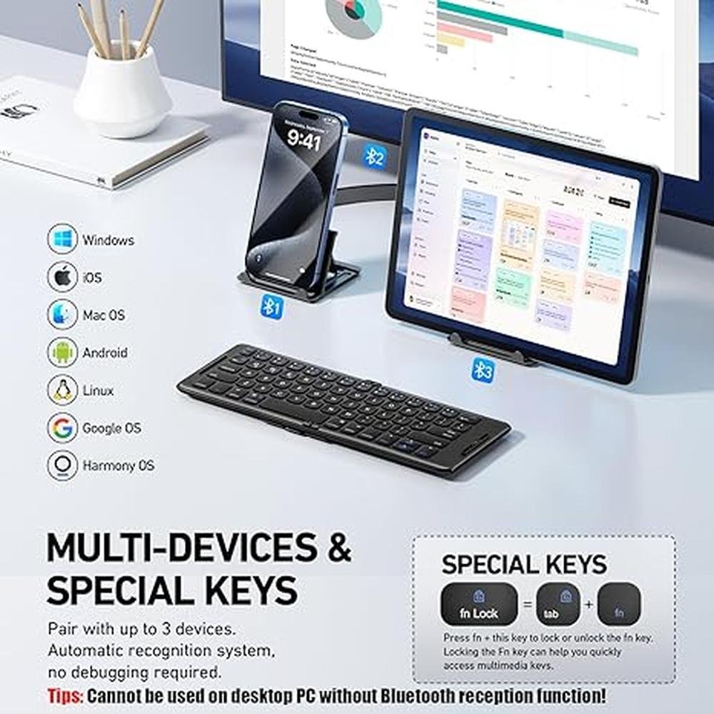 - • Foldable Bluetooth KeyboardUltra-thin portable keyboard for work anywhere, anytime.The keyboard is designed with ergonomic principles in mind, featuring a raised bottom for added comfort and reduced fatigue during prolonged use. The full-size keycaps and seamless folding design make typing more accurate and faster, providing a laptop-like typing experience. Its compact size and lightweight construction make it perfect for travel and business trips.