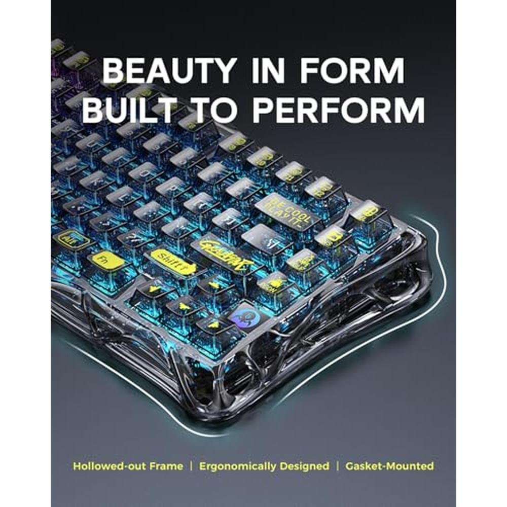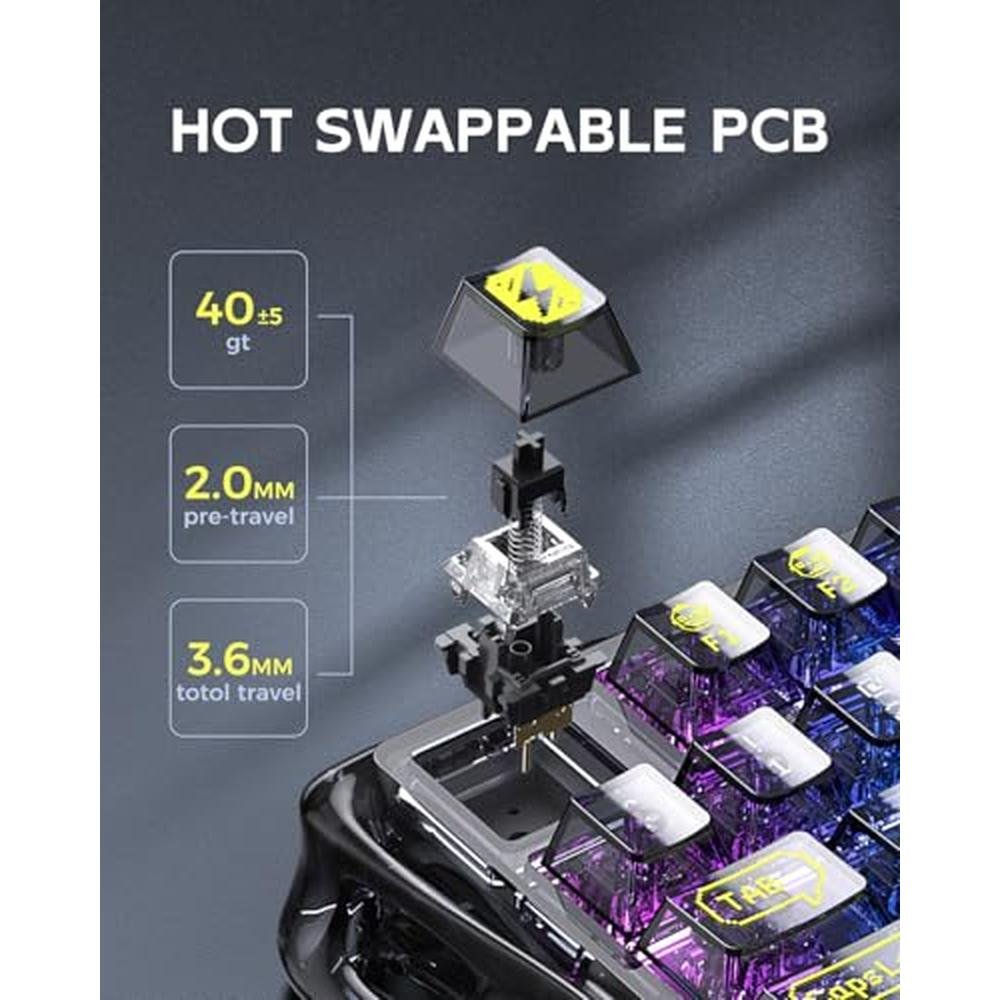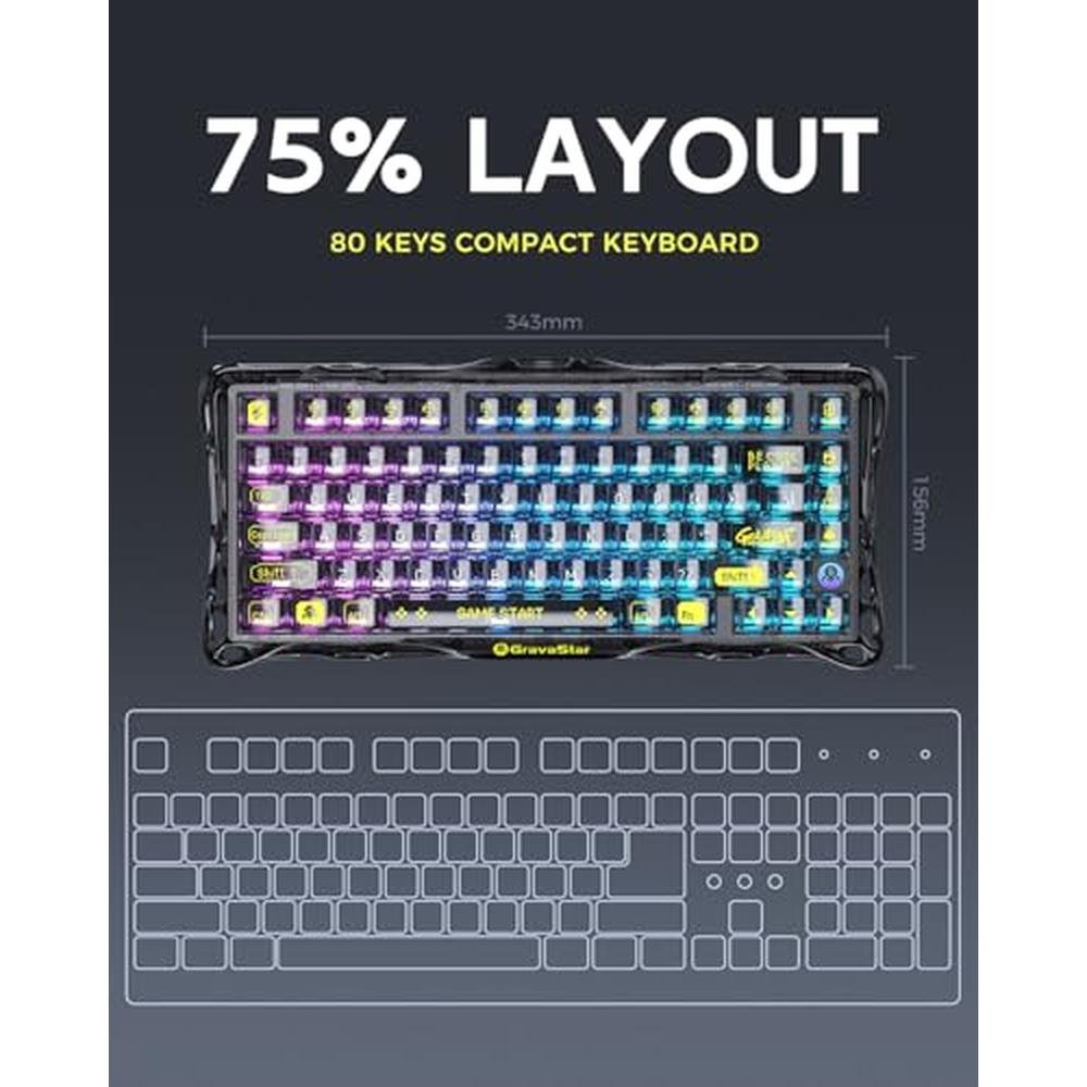 - • Stylish and Unique Design The GravaStar Mechanical Keyboard features a hollow and skeletal design that breaks away from traditional keyboard aesthetics, making it a standout piece on any desk. Constructed from durable PVC material, the transparent frame and keycaps maximize the cool backlight RGB effects and wear-resistant appearance.