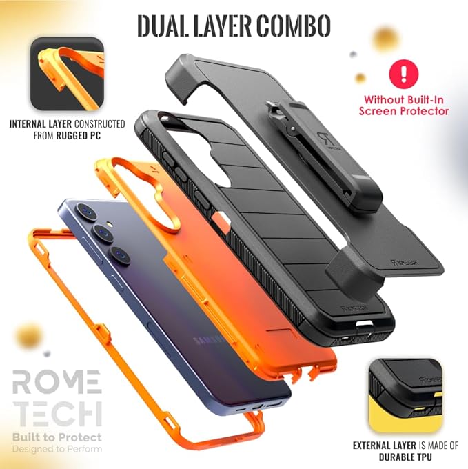 pbTHE PROTECTION YOUR PHONE EAGERLY NEEDSbbrHaving our Samsung Galaxy S25 case holster will be the best decision you make When you purchase carrying cases from Rome Tech today, you can look forward toppbUSE LIKE STANDb - Sturdy Galaxy S25 holster clip allows you to use your phone hands-free. Horizontal kickstand mode can be enabled after you fix the clip in a position convenient for youbrbPROTECTIVE EDGEb - Additional protection for camera provided by Galaxy S25 defender case. A raised, beveled edge helps preserve your camera lip from accidental drops and protects it from being scratched on flat surfacesbrbEASY ACCESSb - Once the holster is removed, you can easily use all functionality of your phone - special cutouts allow you to use buttons, slots, camera, and ports without removing the clip case for Galaxy S25 brbBUTTONS RESPONSIVITYb - We improved the shortcomings of similar case designs and made volume and power buttons more responsive. Use all your phone functional without removing Galaxy S25 case defenderbrbPERSONAL DEFENSEb - Galaxy S25 belt clip holster made of intensified cutting-edge hybrid material with multiple stages of defense. It disperses shock and cushions your phone from damage and hard falls. Ultra-durable design increases drop protection by up to 95 more than traditional casesbrbWEAVE PATTERNb - The inner lining of Galaxy S25 case belt clip is made of a soft wave pattern to prevent any scratches inside of Galaxy S25 case clip on and provide heat dissipation - you do not need to worry about the phone condition even in heavy-dutyppClick Add To Cart now and provide better protection for your cell phone with this Rome Tech OEM Galaxy S25 casep