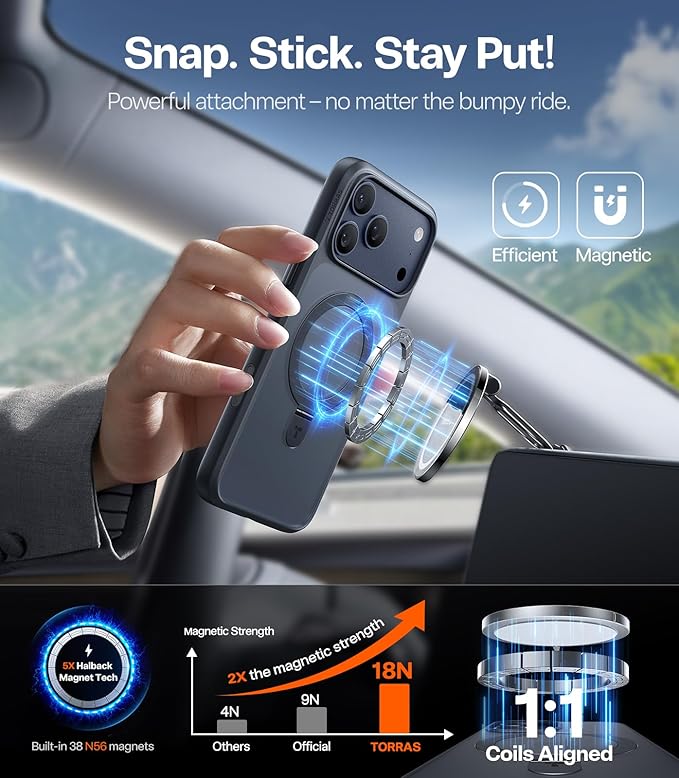 - • Magnetic Pro, Snap Pro: We get it, busy days demand efficiency. TORRAS iPhone 17 Pro Case magnetic has a built-in N52 magnet array, 2X stronger suction than regular. So powerful and precise, snaps onto magsafe accessory with a satisfying click. Charge wirelessly at full speed without removing it, or secure to your car vent mount for hands free navigation on chaotic L.A. freeways. Holds tight through bumps/turns, no drops or constant adjustments. Quick, stable convenience for your on-the-go life