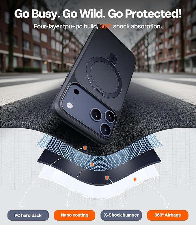- • Shield Securely, Fearless Living: You want slim style and solid protection—this iPhone 17 Pro Case with stand delivers both. It has 2025’s latest 3-layer shock absorber (X-SHOCK 3.0 corner airbags& 360° cushions) for tested to withstand drops from up to 12FT, that’s 3X Military Grade protection. No panic if you slip it at Starbucks runs or knock it at Coachella, your phone stays safe from surprises. It shields the camera/screen like an invisible guard. Live freely, knowing your iPhone is safe