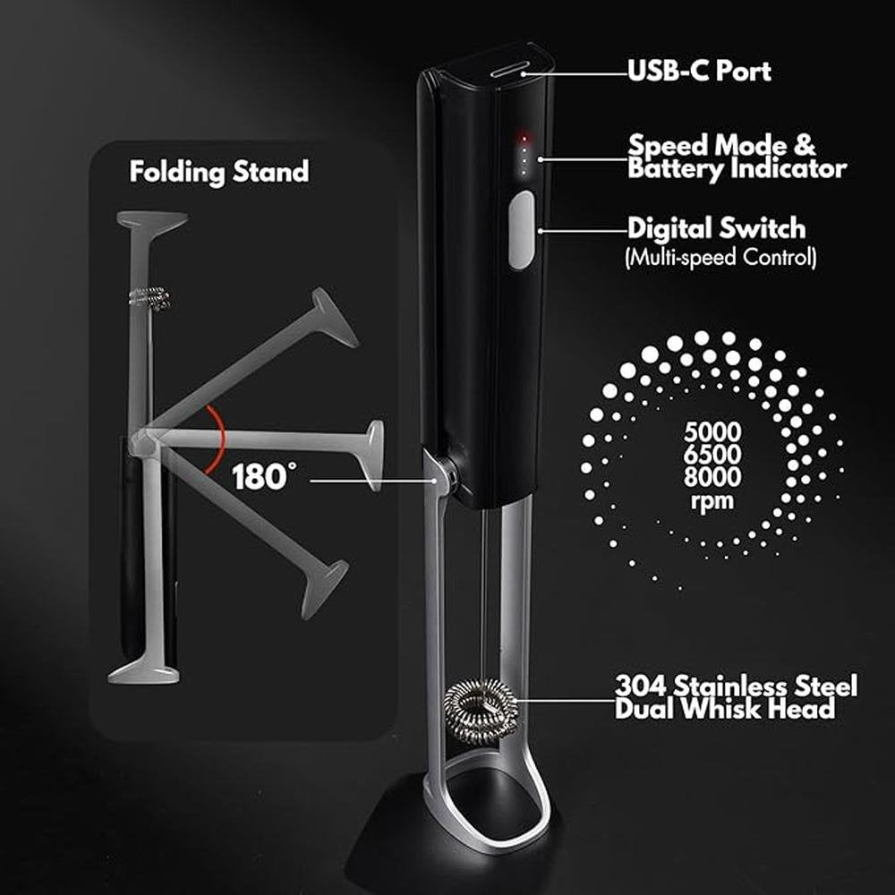 Introducing the NOMACANO Rechargeable Frother Wand, the perfect coffee whisk tool for making creamy and frothy mlik, for latte, cuppcino, hot chocolate, and more. This handheld milk frother wand is made of high-quality stainless steel and is durable and easy to clean. It features a powerful motor with three variable speed settings that can create thick and velvety foam within seconds, and it come with a comfortable grip design makes it easy for daily use. The milk frother is also versatile and can be used for other purposes, such as whisking eggs and making sauces. With its innovative folable stand design, there is no need to purchase traditional stainless steel stand for storage. NOMACANO Handheld Milk Frother is a great addition to any coffee and kitchen gadget.