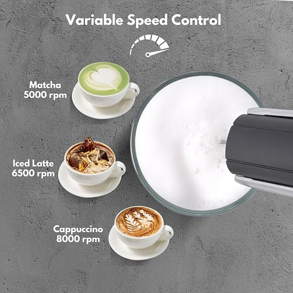 - • Barista Quality Foam Enjoy cafe quality milk foam at home is easier than ever with nomacano handheld frother. Equipped with powerful yet quiet motor which is fine tuned at optimal torque and offer 3 settings of rotational speed control from 5000-6500-8000 rpm. Easier than ever to create velvetty and silky milk froth at instant. Simply enjoy your favorite daily drink beverage such as latte, cappuccino, mocha, matcha, etc
