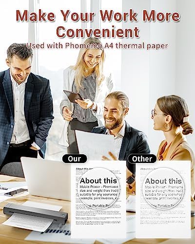 - • Compact Design - Phomemo M08F-A4 Portable Printer is compact and portable, 80 smaller in size and weight than traditional printers, effortless to hold with one hand. The thermal printer is suitable for any scenarios that require mobile printing in businesstravelcarofficeschool. For example, print invoices, exam documents, lists and contracts on site.