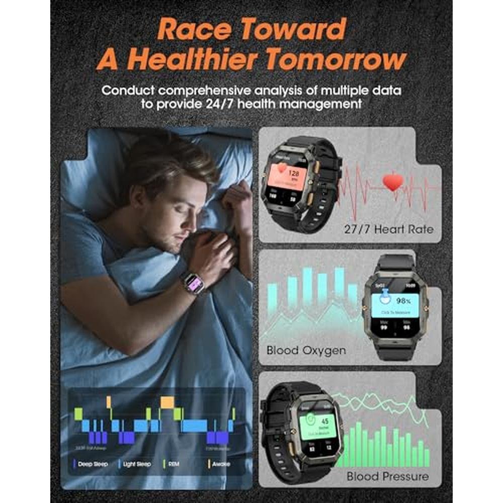 Military Smart Watches for Men (AnswerMake Call), 2.02 Rugged Smart Watch for Android Phones and iPhone, Waterproof Outdoor Sports Fitness Watches with Heart Rate, Sleep Monitor, Black br br Product size 58.346.113.3mm br br Packing size 221.5mm95mm18.5mm br br Weight 61.7g br br Watch Supported Languages English, Simplified Chinese, Japanese, Korean, German, French, Spanish, Arabic, Russian, Ukrainian, Italian, Portuguese, Polish, Romanian, Turkish, Persian br br Touch screen 2.02 HD touch screen br br Resolution 320390 br br Water resistance 5 ATM br br Type of connectors Bluetooth br br Bluetooth BLE5.3 br br Flash Memory 128 MB br br Refresh Rate 65Hz br br Battery Power Rating 450 mAh (15 days) br br Additional features br br 1. Aerospace aluminum and titanium bezel br br 2. 5 ATM water resistance br br 3. 2.02 HD touch screen br br 4. The latest upgraded high-precision optical sensor (Heart rate, Sleep, Blood oxygen, Blood Pressure, Step, Calorie, Distance) br br 5. 100 sports modes (Walking, Running, Cycling, Skipping, Badminton, Basketball, Football, Swimming, Tennis, Rugby, Golf, Yoga, Gym, Dancing, Baseball, Elliptical Machine, Rowing Machine, Trail Running, Skiing, Bowling, Dumbbell, Crunches, mountaineering and other sports) br br 6. Incoming call notifications, Support making and connecting calls (call function) br br 7. SMS and SNS messages notifications (Facebook, Twitter, Line, Skype, WhatsApp, Kakao Talk, Instagram, LinkedIn, Snapchat, etc.) br br 8. Camera control br br 9. Music control br br 10. Sedentary reminders br br 11. 3 levels vibration adjustment br br 12. Brightness adjustment br br 13. Alarm clock br br 14. Timer br br 15. Find phone br br 16. Womens health br br 17. Compatible peripherals iOS (iOS 9.0 or above), Android (Android 9.0 or above) br br 18. AI voice br br Package list br 1 x Military Bluetooth Smart Watch br 1 x Watch Bands br 1 x USB Magnetic Charging Cable br 1 x User Manual