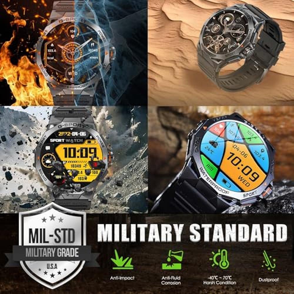 - • Military Standard Mens military smartwatch is made of high quality material, excellent workmanship and comes with a silicone strap that can be used for a long time without being easily worn out, durable design suitable for use in a variety of environments. Outdoor tactical smartwatch has been tested to withstand extreme temperatures and lots of dust, 3ATM waterproof rating can meet the needs of most outdoor enthusiasts, it can resist sweat and rain, it is your outdoor adventure partner.
