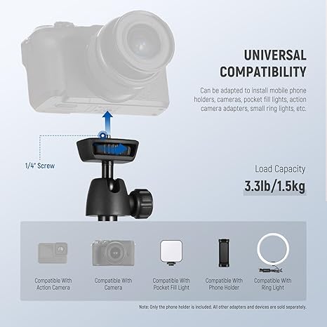 - • All Metal Travel Tripod for Phone Camera Made of robust aluminum alloy, this all metal lightweight tripod stabilizes DSLR cameras (compatible with Sony Nikon Canon), action cameras (adapters not included), and smartphones up to 3.3lb1.5kg. Weighing just 20oz566g, its compact design folds to a 1.640mm diameter for easy portability. The 5 section telescopic poles enable seamless height adjustments, perfect for portraits, selfies, vlogging, photography, and video recording on the go