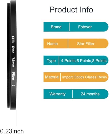 • • Note The surface of the star filter is not smooth, there are a lot of shallow marks (the starburst effect is formed by them). It is not recommended to wipe it frequently. It is recommended by air blower. After using, put it in the filter Pouch, which can reduce dust Stains and avoid scratching filter.And please verify your cameras lens thread size before ordering. Your cameras lens thread size will be marked somewhere on the lens barrel or printed underneath your lens cap.