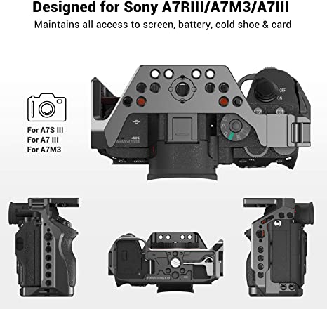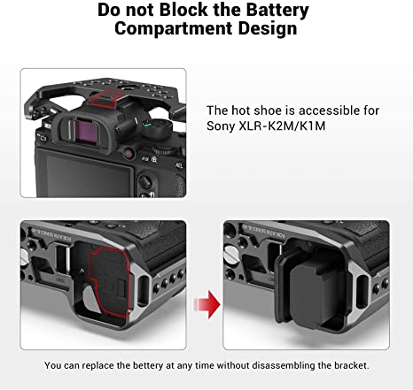 - • FULL ACCESSIBILITY ONLY FITS FOR SONY A7RIII A7III A7M3 Camera. The cage would not block any buttons on the camera and you are able to access not only the battery but even the SD card slot. The hot shoe is accessible for Sony XLR-K2M K1M