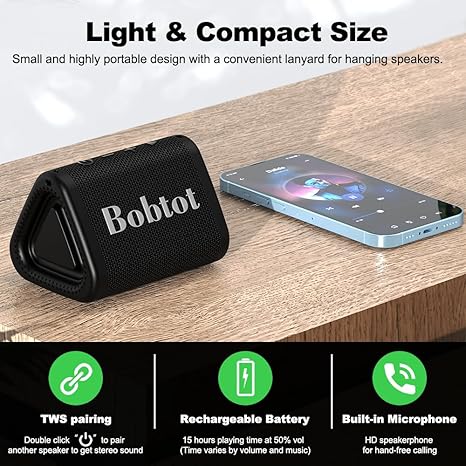 Bobtot Portable Bluetooth Speaker Wireless 10W Peak, IPX7 Waterproof Mini Speaker, 15H Playing Time, Loud and Stereo Sound with Bass, TWS Pairing, Outdoor Small Speaker for Party, Camping, Travel