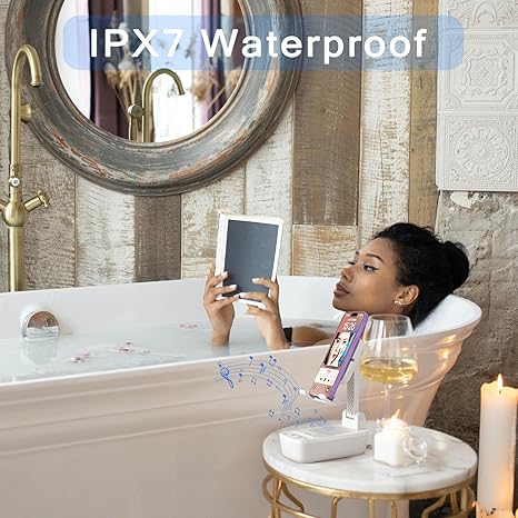 - • IPX7 Waterproof Cellphone stand Certified submersible speaker survives 3.3ft pool depth 30mins, making this cell phone stand with wireless bluetooth speaker is protected against rain, spills and splashes. You can watch a movie or listen to music while you are taking a shower at the same time