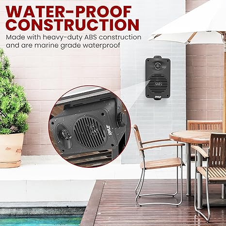 • • WATERPROOF CONSTRUCTION Pyle speakers outdoors are made with heavy-duty ABS construction and are marine grade waterproof making it safe to use in places w heavy water splashes. Excellent for use on boats marine decks patios poolside outdoors