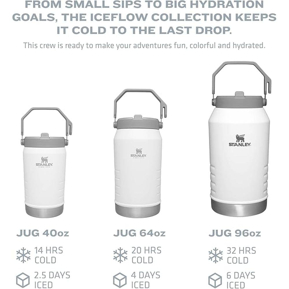 - • ALL DAY REFRESHMENT Thanks to the double-wall insulation, the Stanley Iceflow Flip Straw Water Jug keeps drinks cold for up to 14 hours and iced up to 2.5 days while keeping the exterior sweat-free.