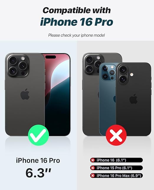- • Compatibility This case is exclusively crafted for the iPhone 16 Pro (6.3-inch display, 2024 new releases). Before purchasing, kindly check your phones model (Settings General About Model Name) to ensure compatibility