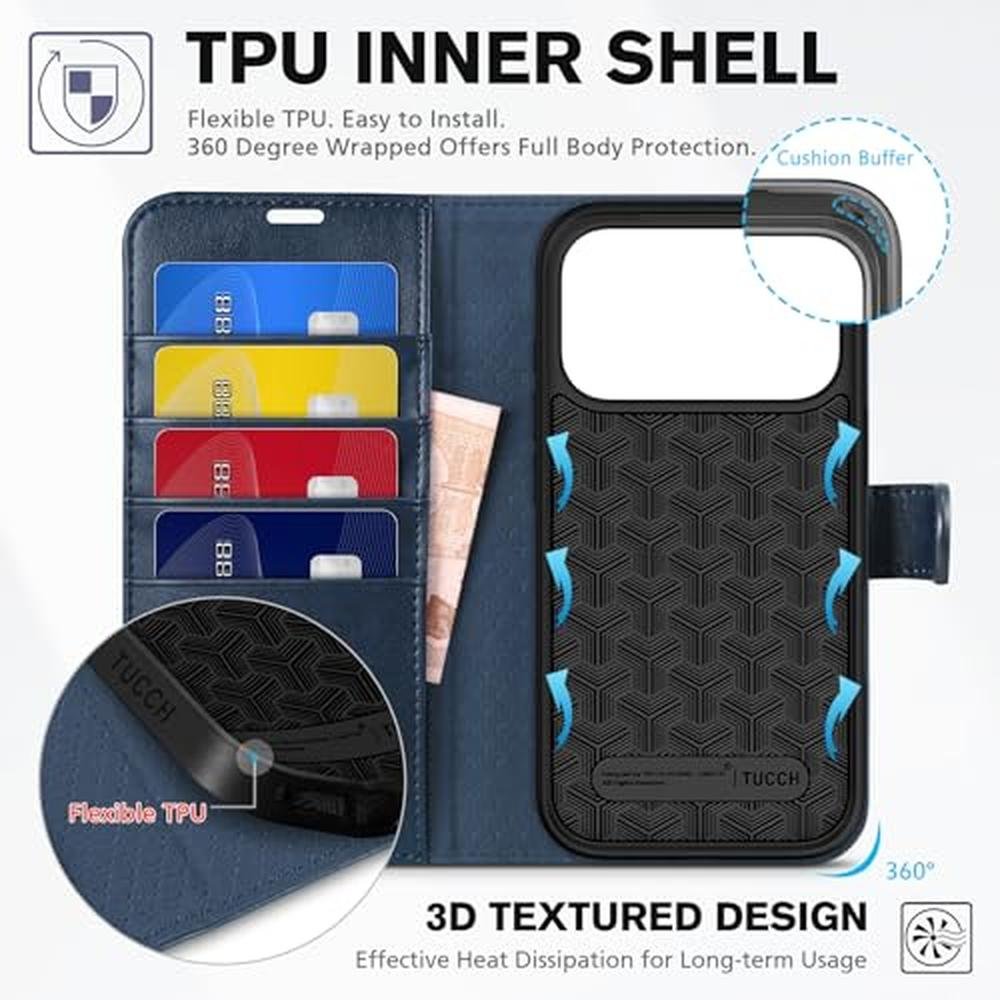 TUCCH is dedicated to making classic & trendy mobile phone wallet cases that are made of premium PU leather, upgraded TPU inner case is softer and not easy to break. TUCCH wallet case will meet your everyday needs and efficiently escalate your time management, making everything easier. Note: This case is ONLY COMPATIBLE WITH iPhone 17 Pro (6.3") 5G 2025 Release. DO NOT FIT other devices. Features: - 4 card slots for your ID and cards, as well as a pocket for cash - Precise cutouts provide easy access to all buttons, ports & camera - Slim profile provides a sleek look and also converts your iPhone for hands-free viewing - Card slots equipped with RFID-blocking technology can protect your sensitive credit card information - Form-fitting interior case (Full-body TPU shockproof inner shell) securely holds your device in place - Premium PU leather exterior cover with magnetic clasp prevents the flap from moving around as well as protecting the screen Package includes: 1 x PU Leather wallet case