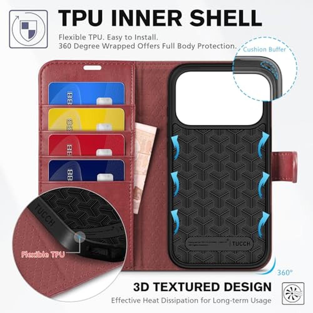 TUCCH is dedicated to making classic & trendy mobile phone wallet cases that are made of premium PU leather, upgraded TPU inner case is softer and not easy to break. TUCCH wallet case will meet your everyday needs and efficiently escalate your time management, making everything easier. Note: This case is ONLY COMPATIBLE WITH iPhone 17 Pro (6.3") 5G 2025 Release. DO NOT FIT other devices. Features: - 4 card slots for your ID and cards, as well as a pocket for cash - Precise cutouts provide easy access to all buttons, ports & camera - Slim profile provides a sleek look and also converts your iPhone for hands-free viewing - Card slots equipped with RFID-blocking technology can protect your sensitive credit card information - Form-fitting interior case (Full-body TPU shockproof inner shell) securely holds your device in place - Premium PU leather exterior cover with magnetic clasp prevents the flap from moving around as well as protecting the screen Package includes: 1 x PU Leather wallet case