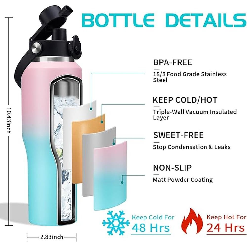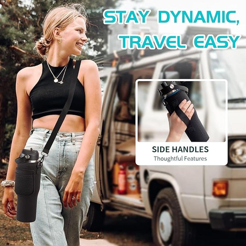 Included Components Water Cup Sleeve with Strap & Side Handle, 32oz Water Bottle that Fits in Cup Holder Body, Insulated Tumbler Silicone Bottom Boot, Auto Spout Lid, Straw Lid