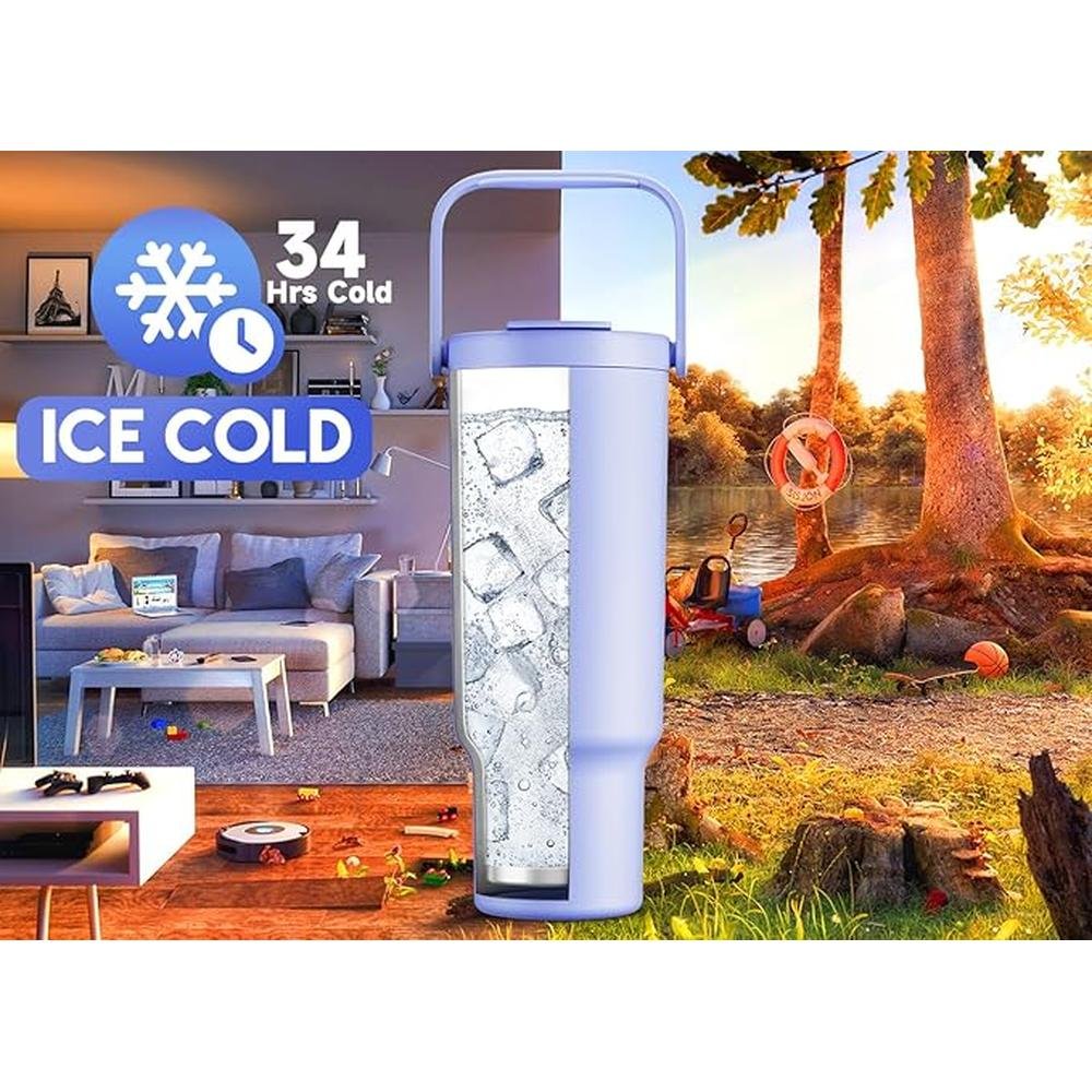 - • KEEPS COLD. With double-wall vacuum insulation, Meoky 40 oz tumbler with handle stays cold for 34 hours and hot for 10 hours.