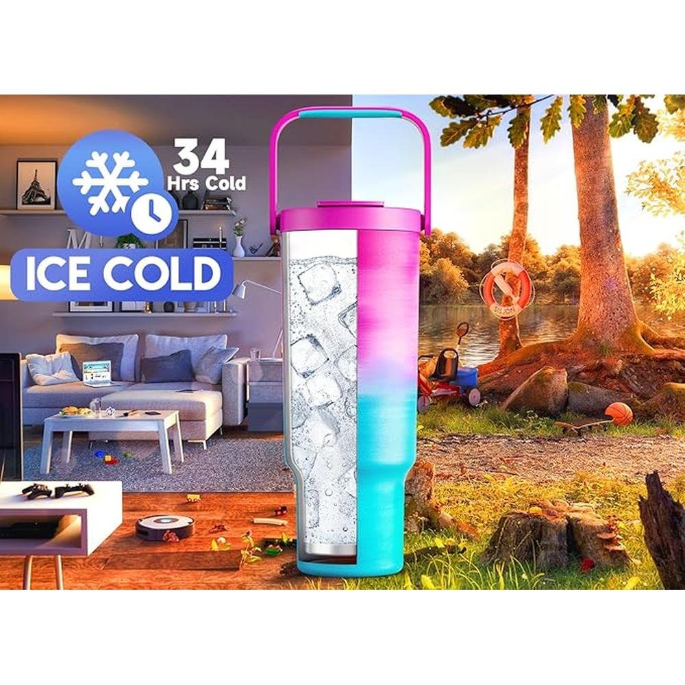 - • KEEPS COLD. With double-wall vacuum insulation, Meoky 40 oz tumbler with handle stays cold for 34 hours and hot for 10 hours.