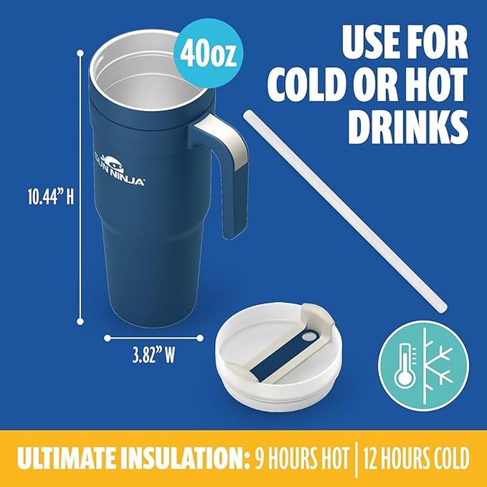 • • Convenient and Stylish Design The Sun Ninja 40oz Tumbler is available in 3 colors and is equipped with an ergonomic handle for easy carrying and drinking on the go. This 40oz coffee tumbler is ideal for both indoor and outdoor activities.