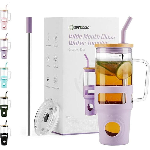 Glass Tumbler with Straw and Lid, 32oz Reusable Iced Coffee Tumbler with Handle Purple, Glass Water Bottles Fit in Cup Holder, Smoothie Cup with Lid, Clear Water Bottle with Straw