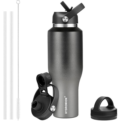 HYDROWION Water Bottle Insulated (Cold 48 hrs, Hot 24 hrs) 40 oz Stainless Steel Water Tumbler with Leak Proof Straw Lid, Spout Lid and Flex Cap,Double Wall Travel Tumbler Cup, Black&Grey