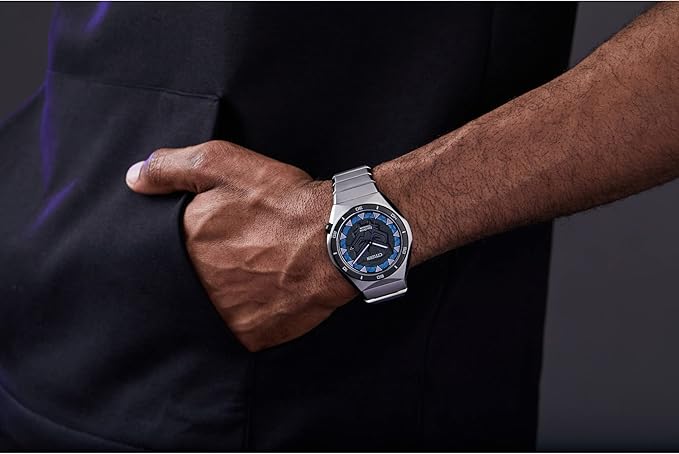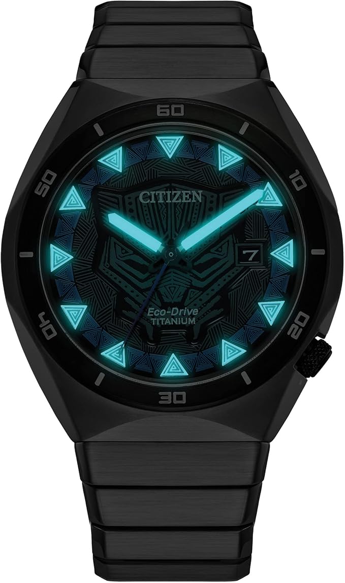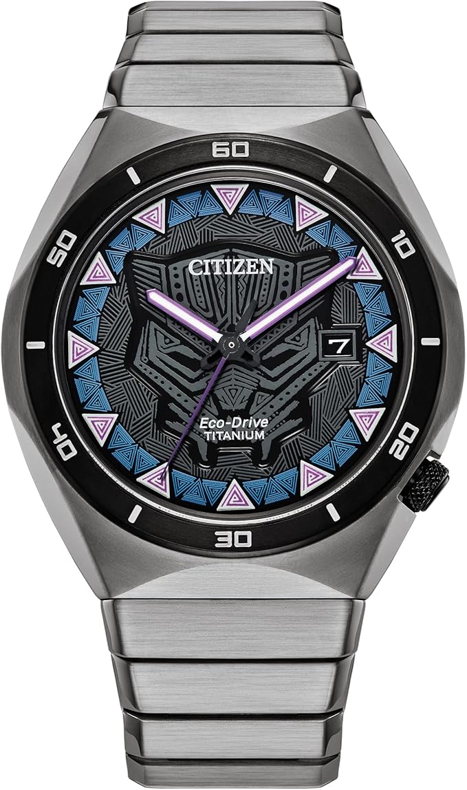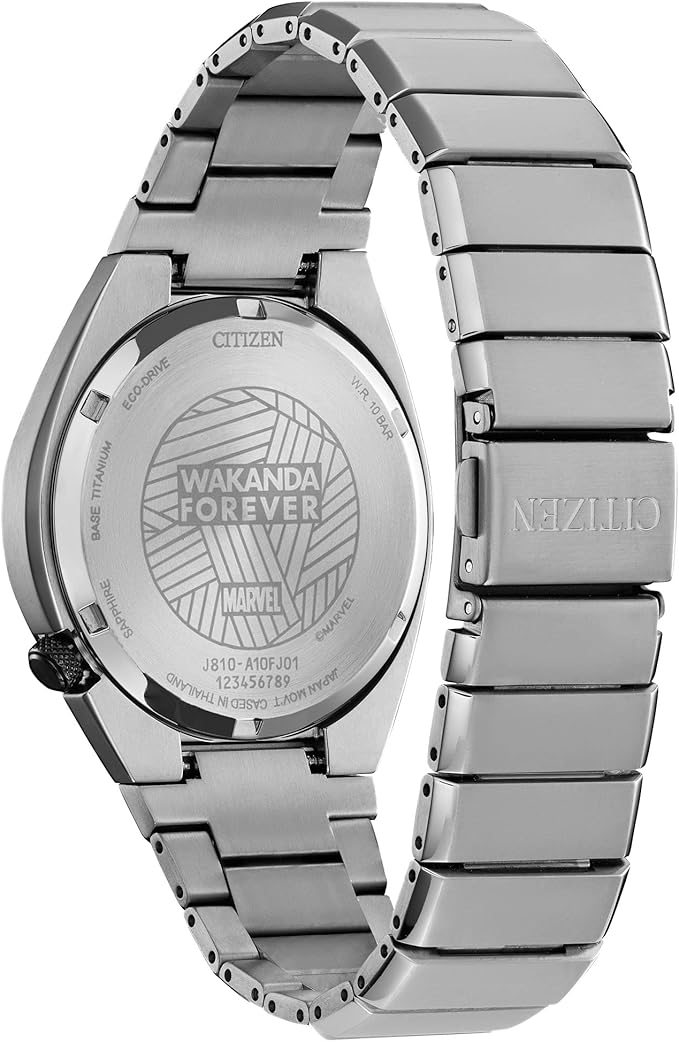 Decide what kind of King you will be wearing in the new Black Panther watch from Citizen’s Marvel Classic Avengers collection. The silver-tone Super Titanium™ case features a gray resin stamped bezel and a black 3-hand dial with date that is finished with a sapphire crystal and showcases the Black Panther patterned icon under luminous hands and markers. The silver-tone stainless steel bracelet fastens with a fold-over clasp and push buttons. The case back further emphasizes the majesty of T’Challa with the engraving, “Wakanda Forever.” The special packaging includes a Marvel collector’s card illustrating the Black Panther’s superhuman power in his Wakandan Vibranium suit that is strong and lightweight, just like Citizen’s proprietary Super Titanium™ technology. This exceptional watch is powered by light with Eco-Drive and never needs a battery.