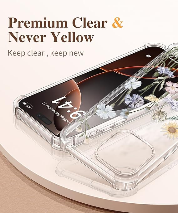 - • Clear Chic Floral Pattern The clear design with stylish floral pattern shows your phone s original beauty and expresses your personality The advanced printing keeps the pattern vibrant from fading, and the anti-yellow material allows lasting clarity