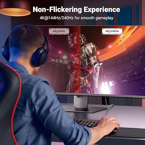 - • Displayport 1.4 Enhanced Transmission The DP 1.4 version transmits data at speeds of up to 32.4Gbps and 240Hz. With stable signal transmission, the USB C to DP cable can ensure amazing sound and image quality, and an end to screen flickering. It supports HDCP2.3, variable refresh rate (VRR) and auto low latency mode (ALLM) which brings you a smoother gaming experience. It also supports flawless audio including eARC, DTS, and Dolby. Through this you can get an immersive viewing feast