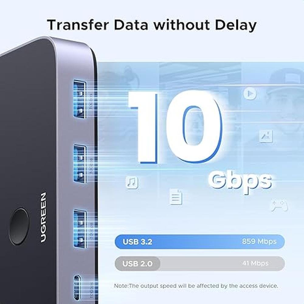 - • 10Gbps Transfer Speed: The USB-C switch is equipped with 4 USB 3.2 Gen 2 ports and speeds up to 10Gbps. Faster than traditional 5gbps USB Switches, Transfer 1 GB files in 1.5 second to improve work efficiency without waiting.